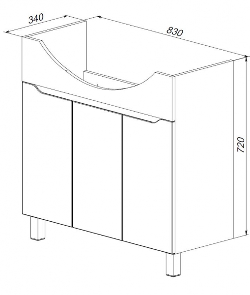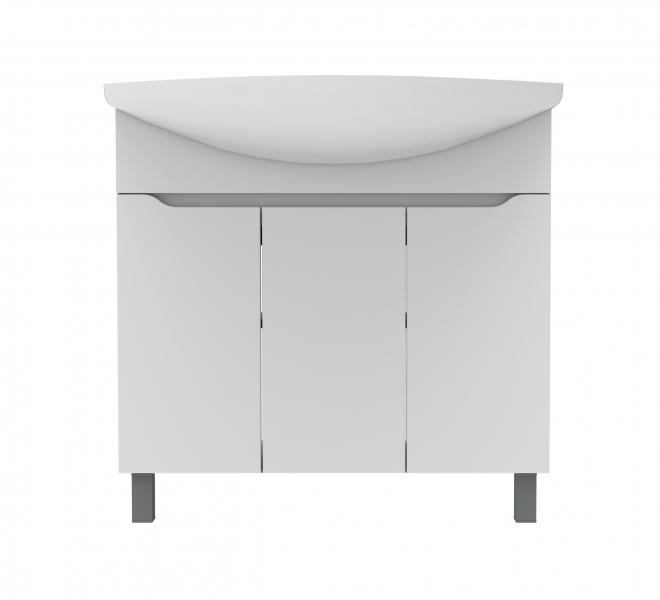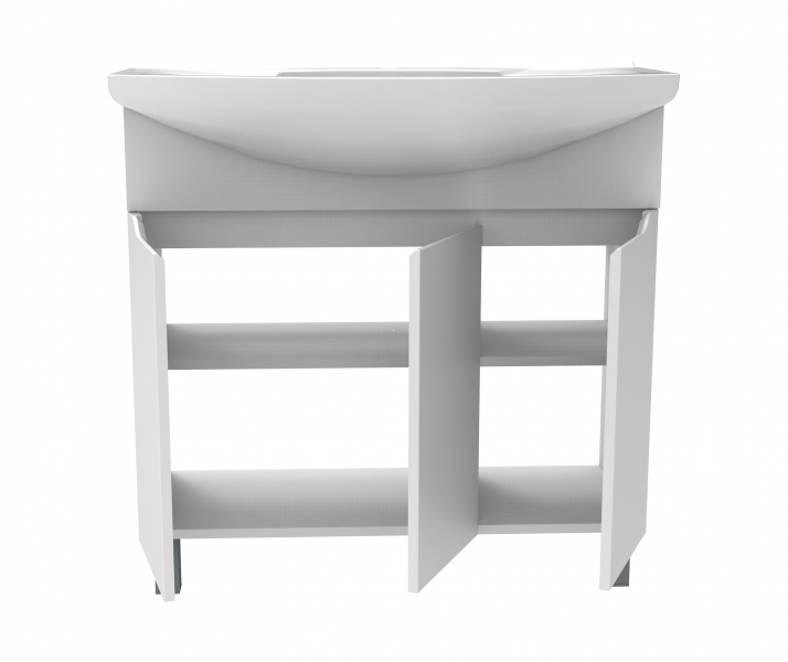 Тумба под умывальник с тремя распашными дверцами и интегрированными ручками. Фасады — белая глянцевая эмаль, боковины — матовая эмаль. Внутри одна съёмная полка.