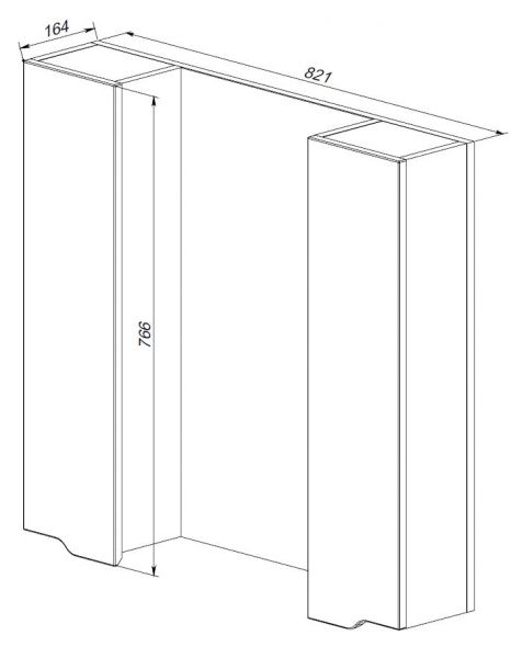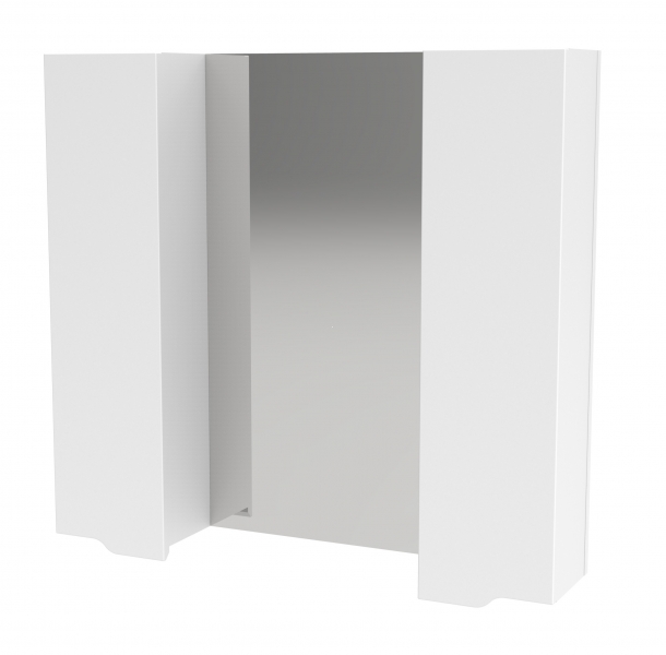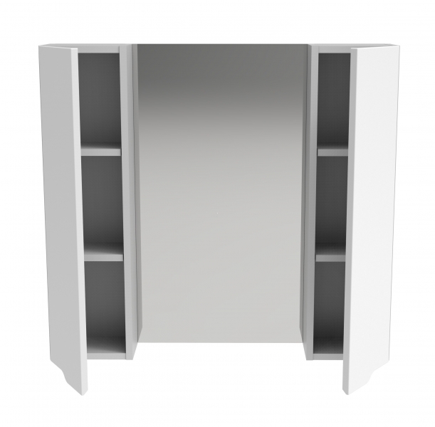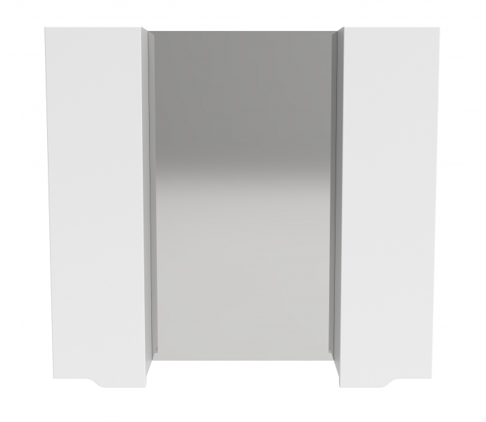 Слева и справа расположены шкафчики, а по центру — зеркальное полотно. Каждый шкафчик оснащён двумя съёмными полками и дверцей с интегрированной ручкой. Фасад выполнен из белой глянцевой эмали, боковины — из матовой эмали.