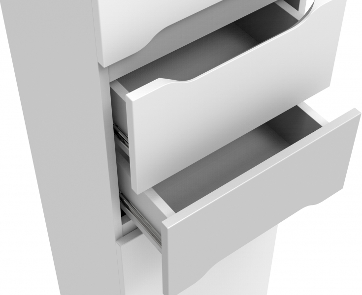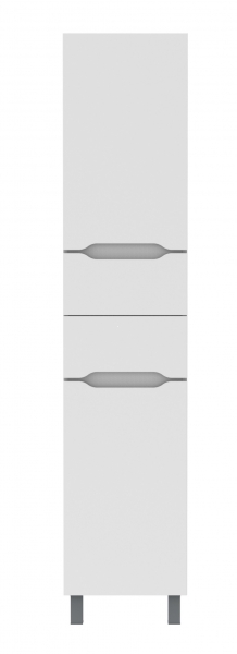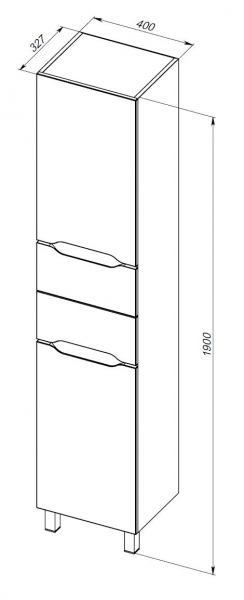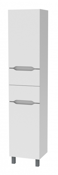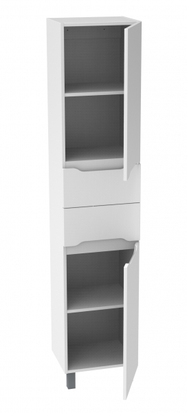 Шкаф оснащён двумя распашными дверями — верхней и нижней, за каждой из которых расположена одна полка. По центру изделия находятся два выдвижных ящика без доводчика. Фасад выполнен из белой глянцевой эмали, боковины — из матовой эмали.