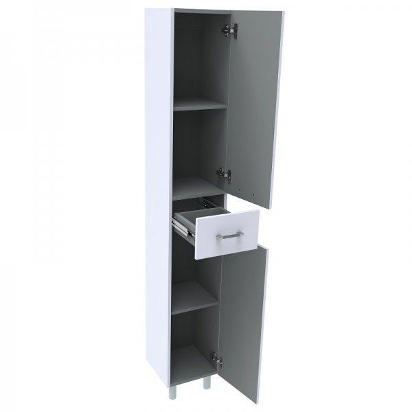 Это вместительный напольный шкаф, выполненный в минималистичном стиле. Он изготовлен из ЛДСП и покрыт белой матовой эмалью, что придаёт ему современный и лаконичный внешний вид.