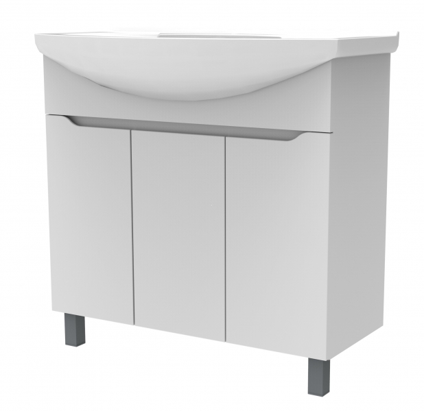 Тумба под умывальник с тремя распашными дверцами и интегрированными ручками. Фасады — белая глянцевая эмаль, боковины — матовая эмаль. Внутри одна съёмная полка.
